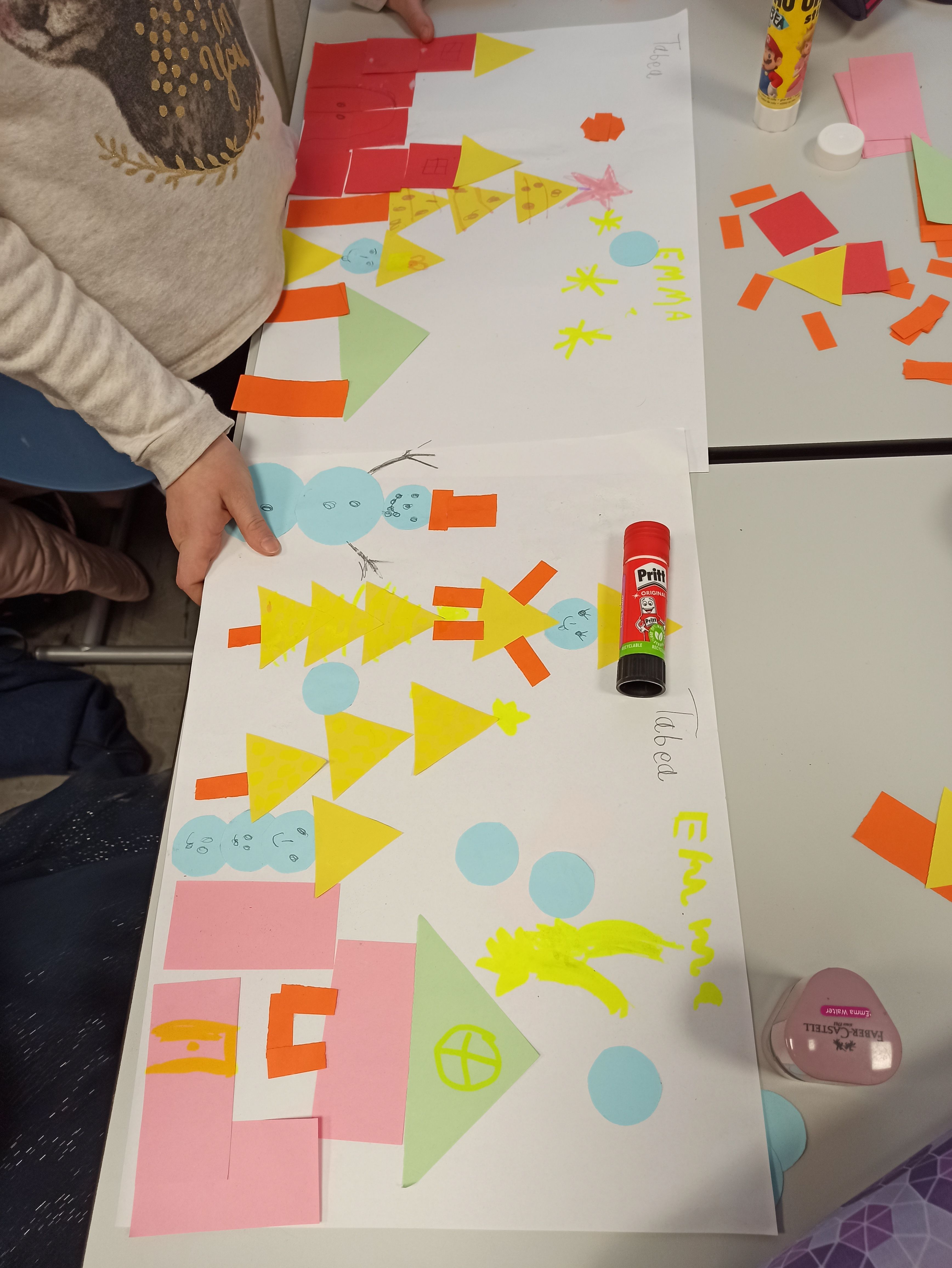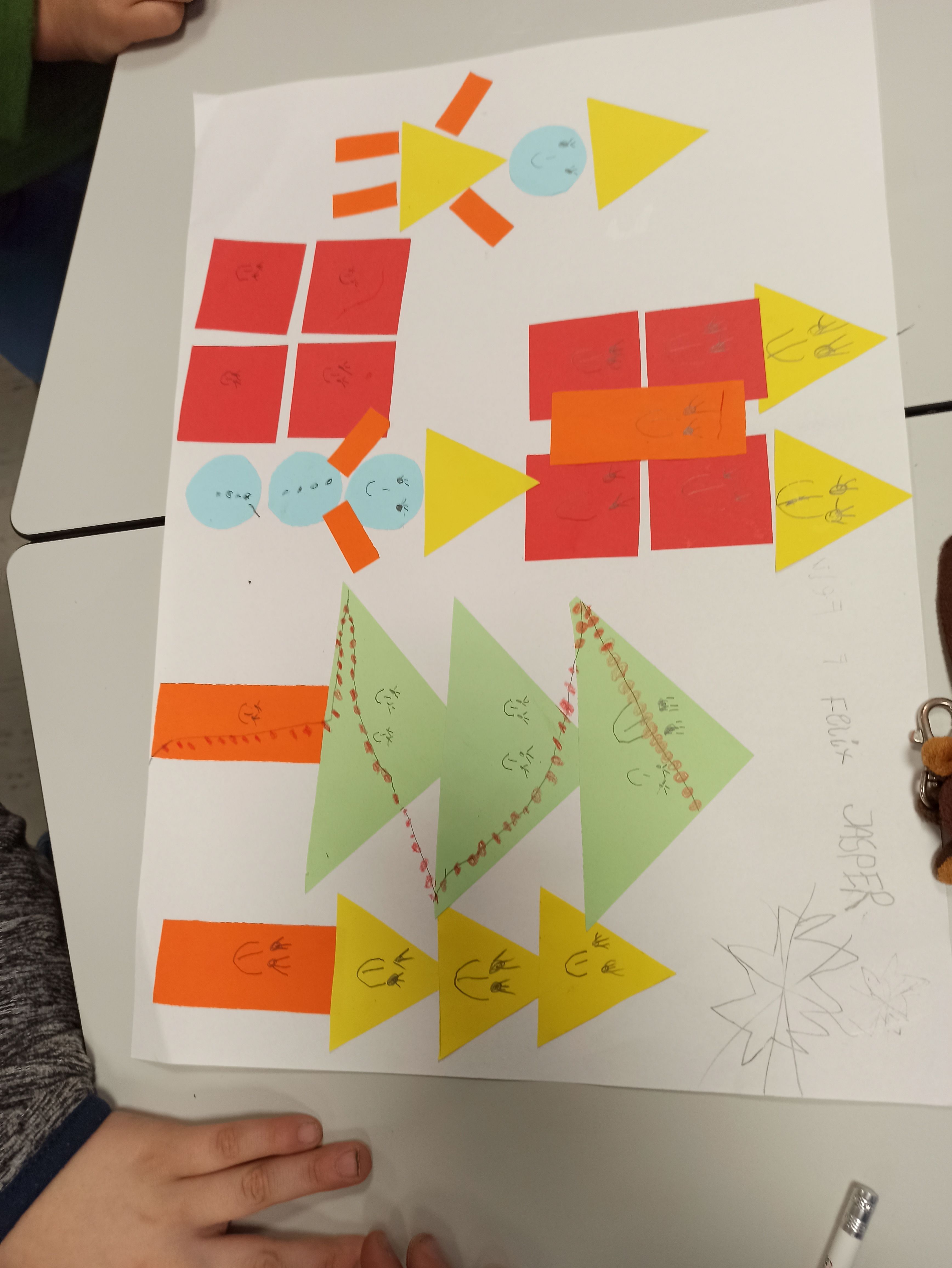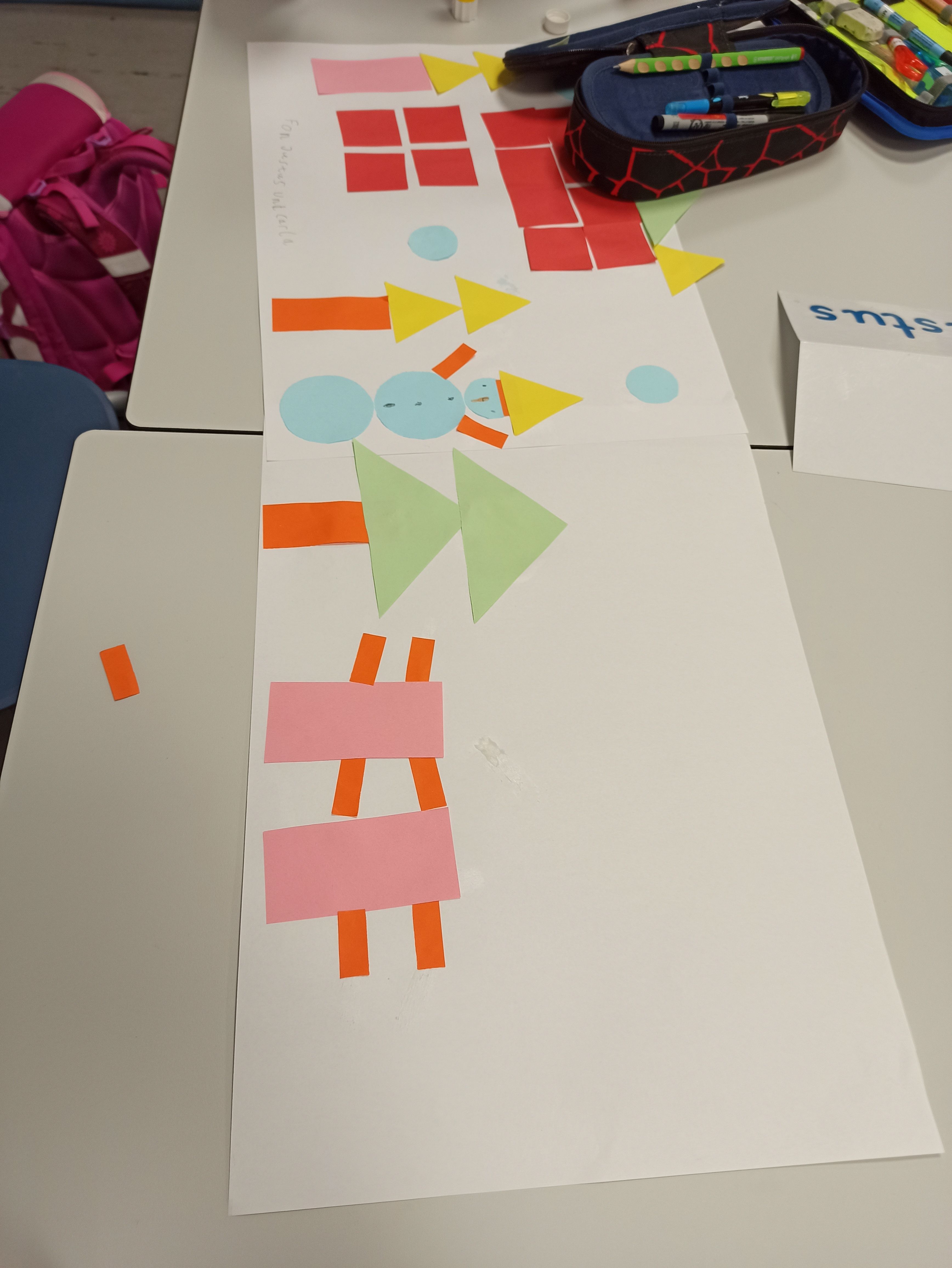 In einem kleinen Winterprojekt haben die Schülerinnen und Schüler geometrische Formen genutzt, um kreative Winterbilder zu gestalten. Die Fledermausklasse hatte großen Spaß daran, ihre eigenen Winterlandschaften zu gestalten. Sie experimentierten mit den Formen und entwickelten dabei ihre kreativen Fähigkeiten. Das Projekt förderte nicht nur ihre gestalterischen Fertigkeiten, sondern auch ihr räumliches Denken und ihre Feinmotorik.